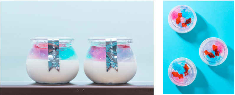 基底口味為牛奶布丁,其中添加了天然魚膠,上面則鋪有彷彿水面般的透明果凍,創造出夏季海洋感。果凍配色為紅色和藍色,使人聯想到號稱夏季風物詩的金魚缽。價格450日幣,含稅。