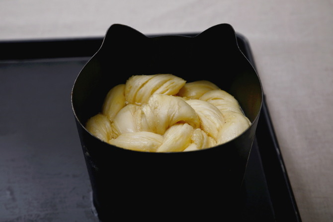 日本京都限定丹麥貓,完美呈現奶油風味,將低溫完全發酵的麵團以三股辮放入模具,讓成品完美又漂亮。使用富含奶油的丹麥麵團所製作的貓咪吐司,表皮酥脆,內裡柔潤鬆軟,是風味濃郁的逸品。
