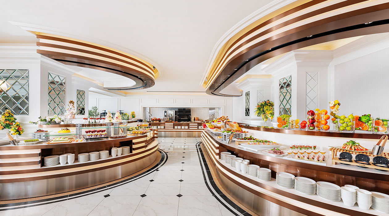 開放式的餐廳採光明亮,菜色豐富。不只是料理的色香味,飯店也希望能夠提供用餐者最頂級的用餐體驗,對於視覺安排上也有所堅持。純白色的牆壁、餐具、檯面搭配繽紛鮮豔的餐點,別具美感。