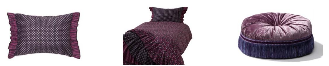說到Francfranc,怎能沒有蕾絲、泡泡袖?照片中的枕頭套將Francfranc少女的風格和ANNA SUI暗黑夢幻的色調結合在一起。枕套價格4,000日幣,被套則根據尺寸,分為單人床15,000日幣、加大單人床16,000日幣、雙人床17,000日幣。最後要介紹抱枕。這款抱枕光是外觀就很特別,中間凹下去,令人聯想到造型特殊的法式甜點,價格5,800日幣。