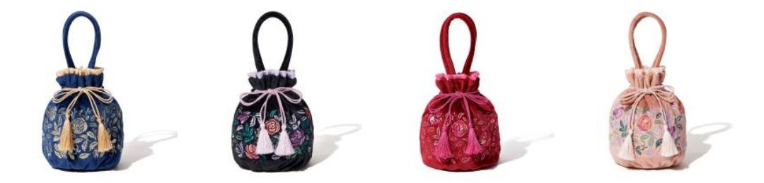 接下來要介紹的是本次最值得買的商品--束口袋!束口袋共有4種款式,各3,000日幣。花紋全都有玫瑰刺繡,不只可以當外出包,也可以拿來收納手帕、電線、行動電源等。