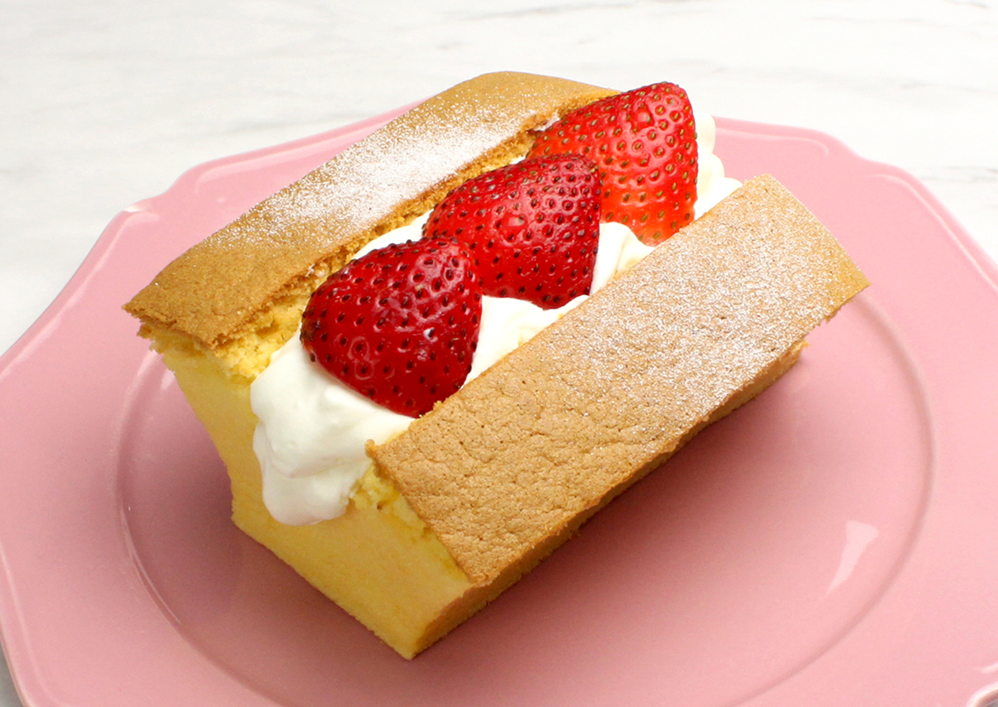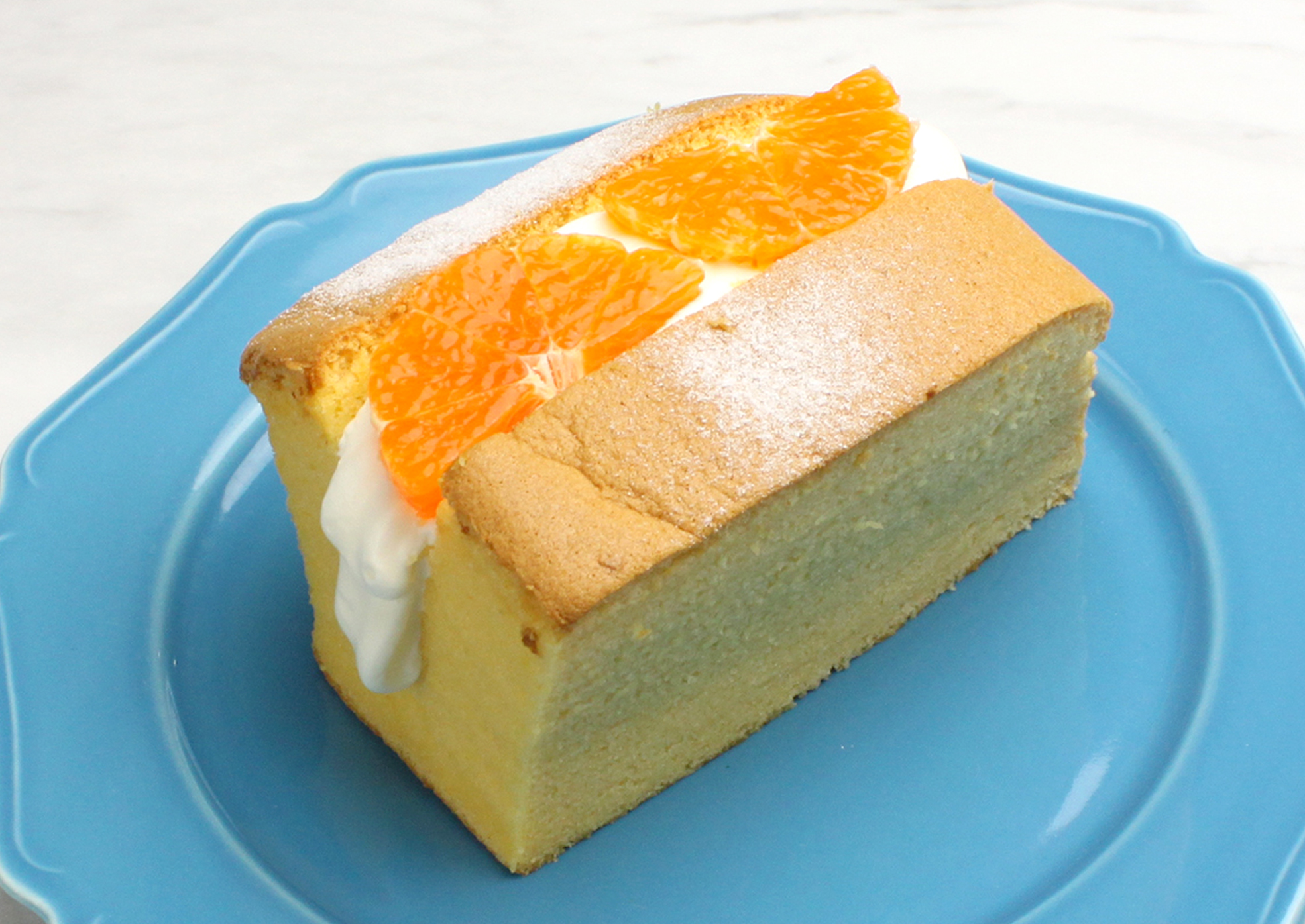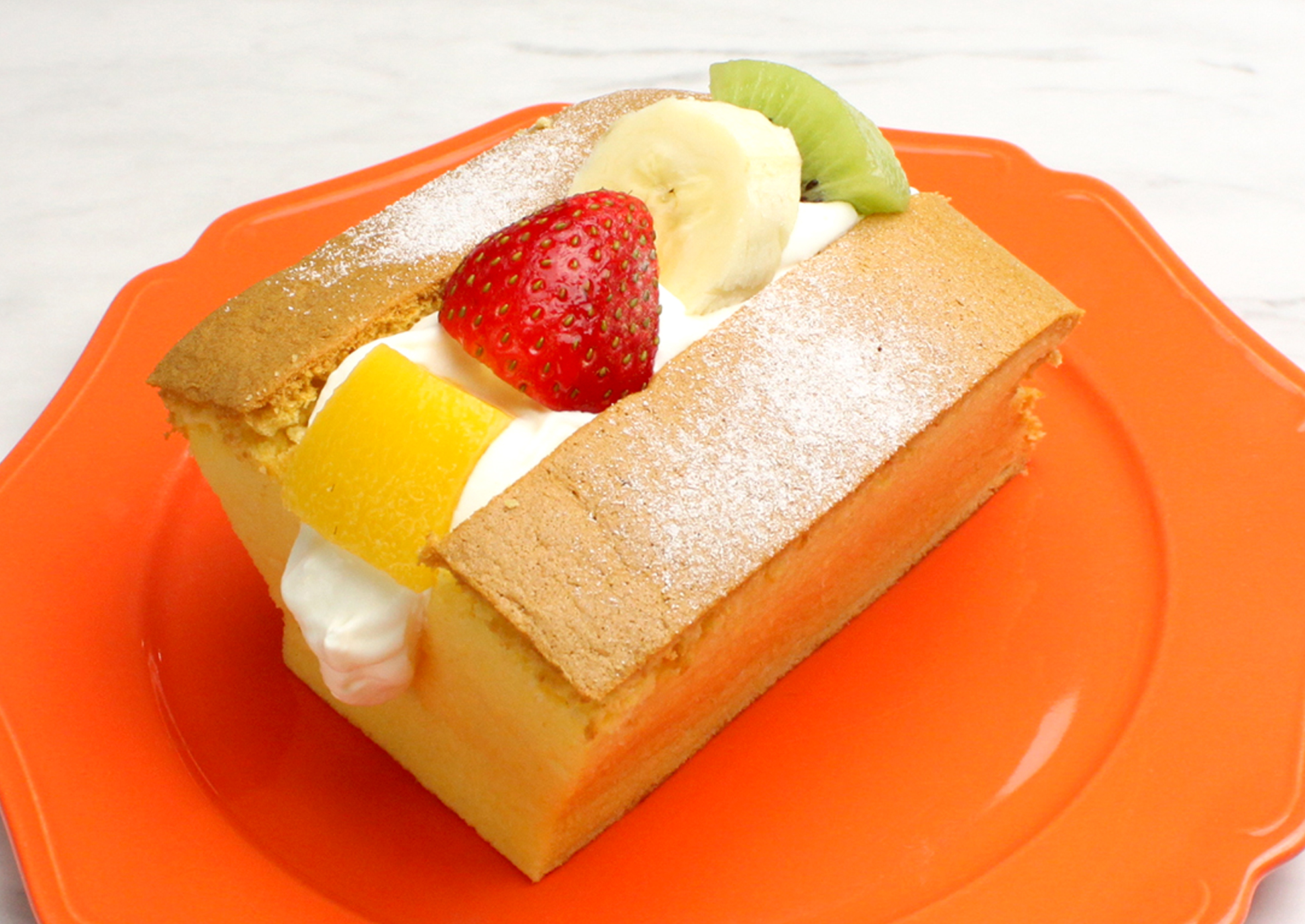 將台灣古早味蛋糕切開,夾入滑順鮮奶油及水果,層次豐富!分別有新鮮多汁草莓風味、綜合水果、柑橘。