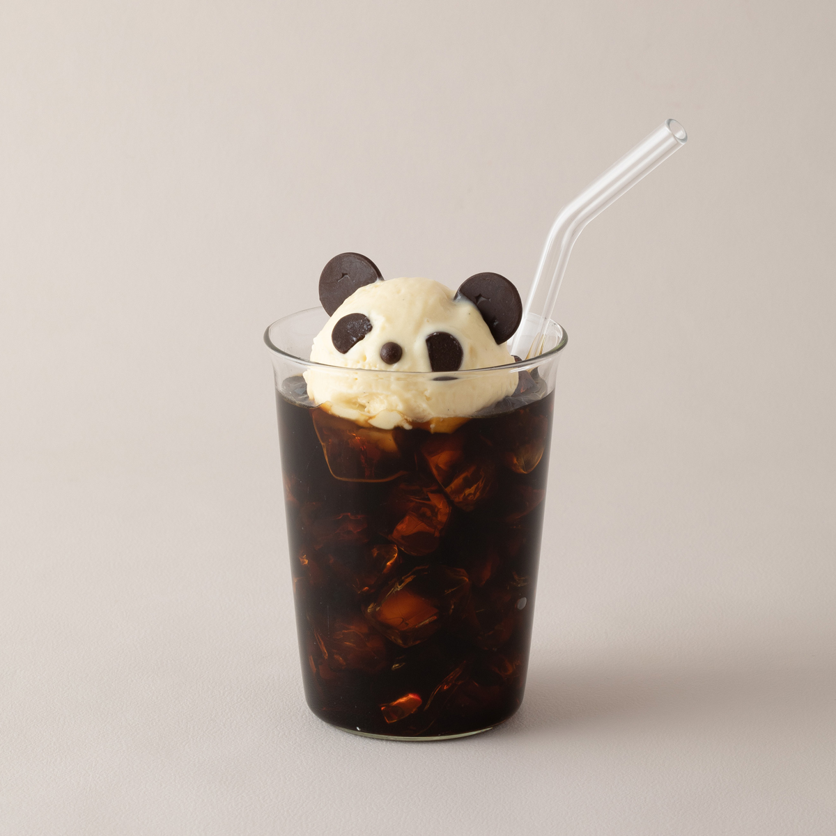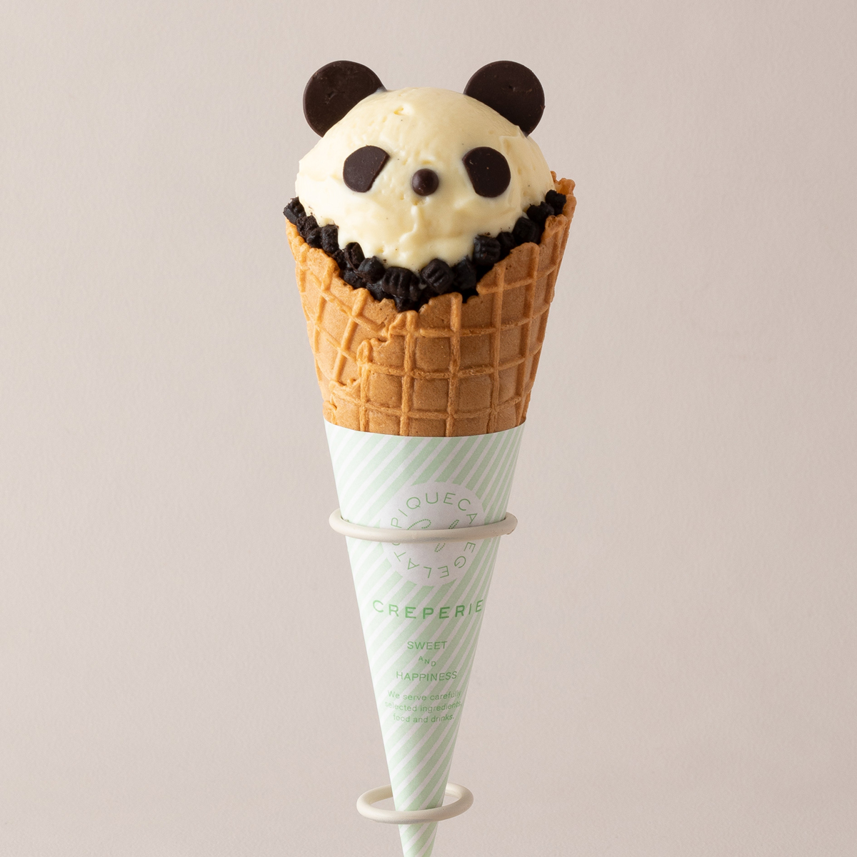 由大小兩球頂級義式香草冰淇淋組成的熊貓冰淇淋,脖子的部分灑上一圈可可餅乾,眼睛及耳朵的部分則是用Couverture巧克力妝點。