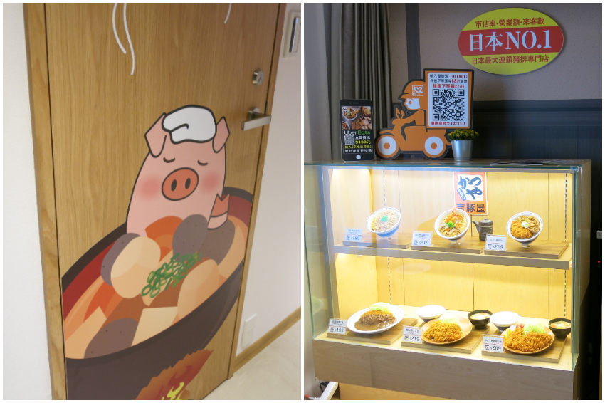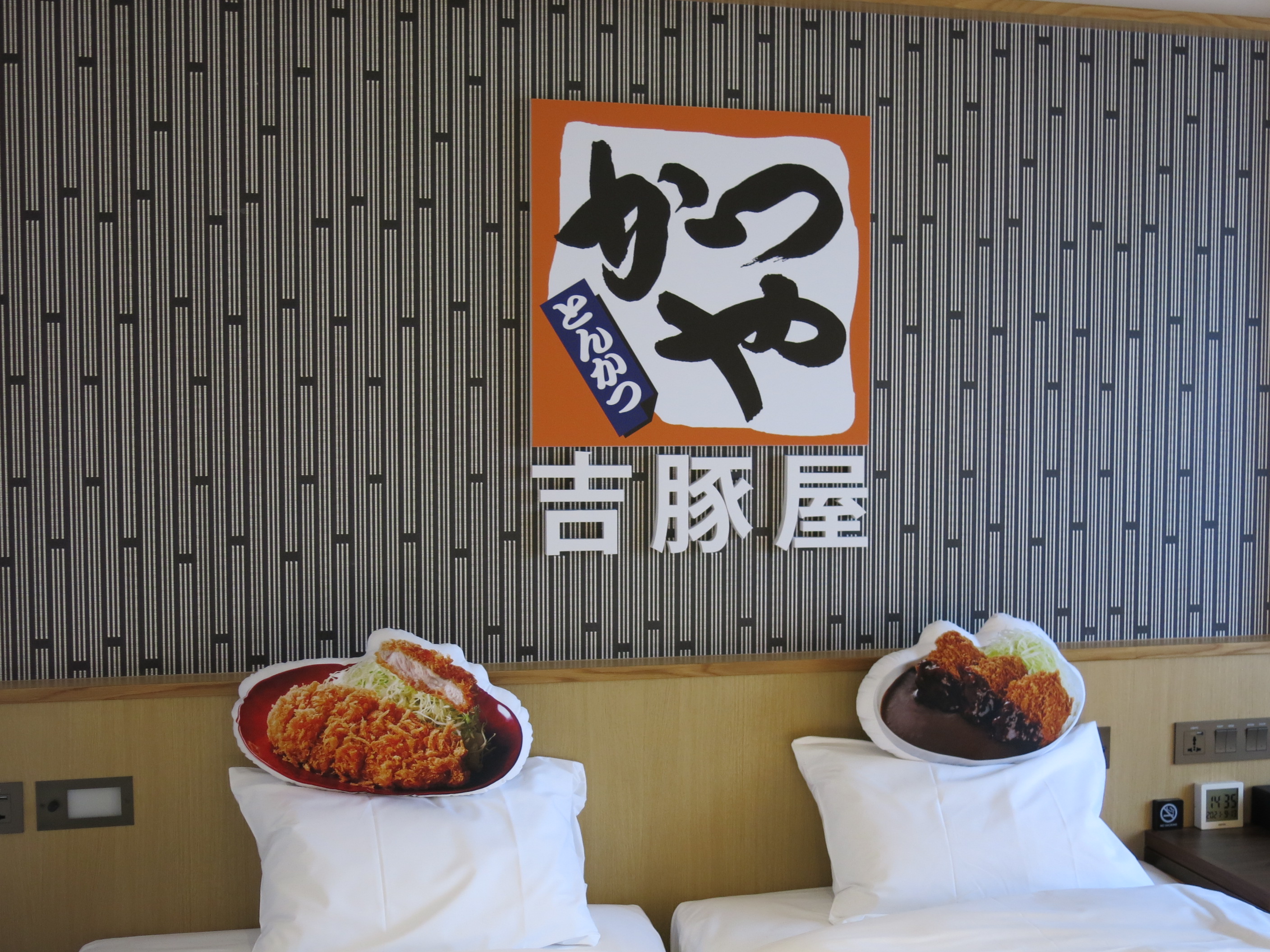 把房間佈置成像在吉豚屋餐廳裡,連食品展示櫃都有,讓豬排陪你入眠!一進門就看到浴室門上的可愛豬豬壁貼,床上還有豬排和咖哩飯抱枕,真的很像來到吉豚屋門市。如果你看著看著肚子就餓了的話,只要掃瞄房內的QR CODE就能訂餐哦!