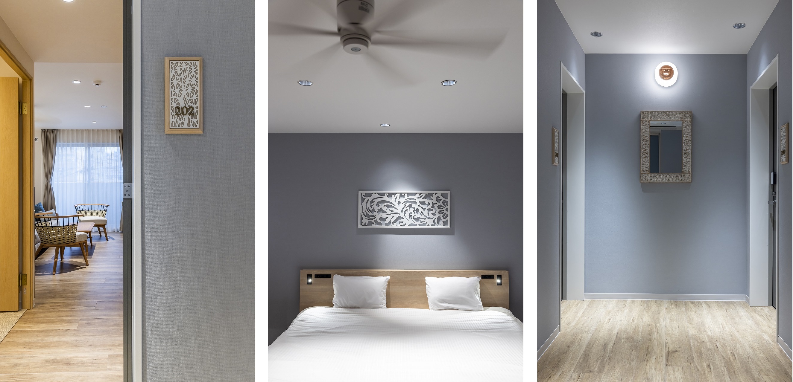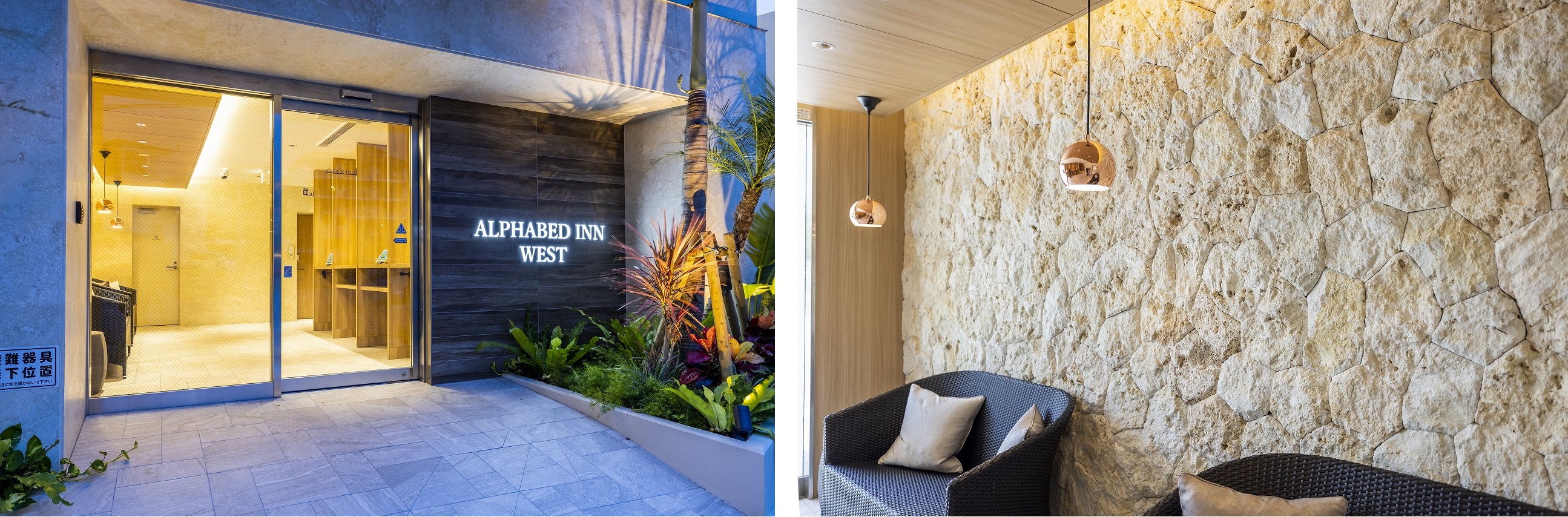 看完內部裝潢以後,來看旅館的風格設計。ALPHABED INN採用了琉球石灰岩的牆壁,天花板則使用了天然木材,給人一種清新的南國風情。不只如此,照明不是採用呆版的日光燈,而是吊燈,增添不少度假氛圍。在器具上,旅館也採購了不少附近壺屋通的陶器,充滿創意又不失格調。