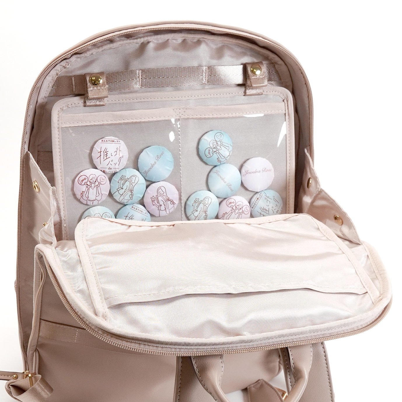 包內設有專放徽章、手燈、票券等不同小物的口袋,只要稍微把拉鍊拉開,就能取出票券,設計十分便民。另外,雙面透明口袋的部分可以放入寫真小卡、立牌、鑰匙圈和徽章等,作為觀賞用,小物都可自由調整位置。