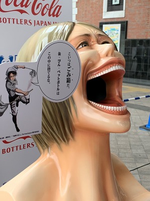 有鑑於此,日本財團「海と日本PROJECT」與可口可樂合作進行了一項「進擊的海拾人」企劃,主要是希望能夠減少垃圾與廢氣物排入海洋,繼6月份第一次合作後,這次於JR大分站的可口可樂自動販賣機旁,設置了約1公尺高的「純潔巨人」垃圾桶,並刻意設計成血盆大口的模樣,讓民眾能夠確切將垃圾丟進桶內;而之所以會選在大分縣進行這項活動,最主要的理由就是因為《進擊的巨人》作者諫山創出生於此地,便以大分縣為領頭羊,希望能喚醒民眾妥善為垃圾分類的環保意識。