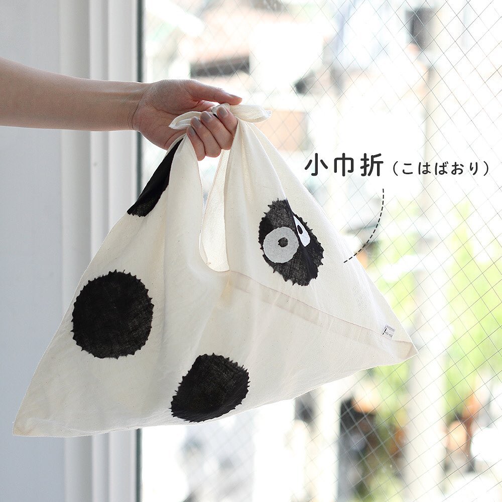 平常如果經常關注SOU・SOU的商品,相信你應該對招牌商品之一的「小巾折」頗有印象,看似像是包裹物品的布巾,但實際上放入手機、錢包、鑰匙等小物帶出門完全沒問題、也相當輕便喔!這款與三鷹之森吉卜力合作的灰塵精靈小巾折,是由京都工匠「田端和樹」透過高超且特殊的傳統染色技巧,日復一日不斷反覆製作,才得以能夠在布面上染出栩栩如生的小黑炭喔!此外,使用的布料也相當講究,是採用了三重縣生產的伊勢棉所製成。