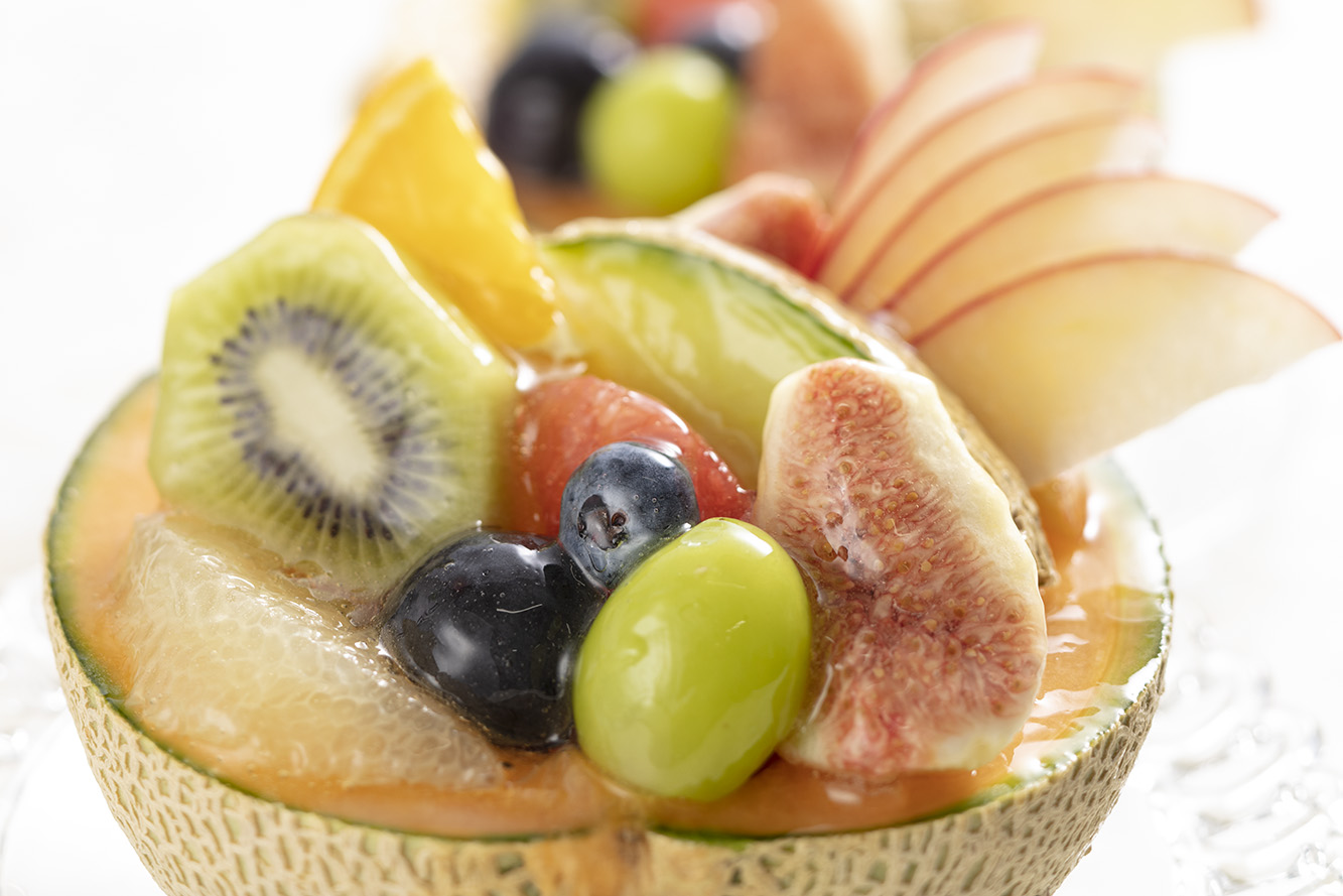 Kagunokonomi特製水果盤,在直徑15公分以上的紅肉哈密瓜中,放入岡山縣Pione大葡萄等10種水果,整份可供3人同享。價格4,320日幣,含稅。