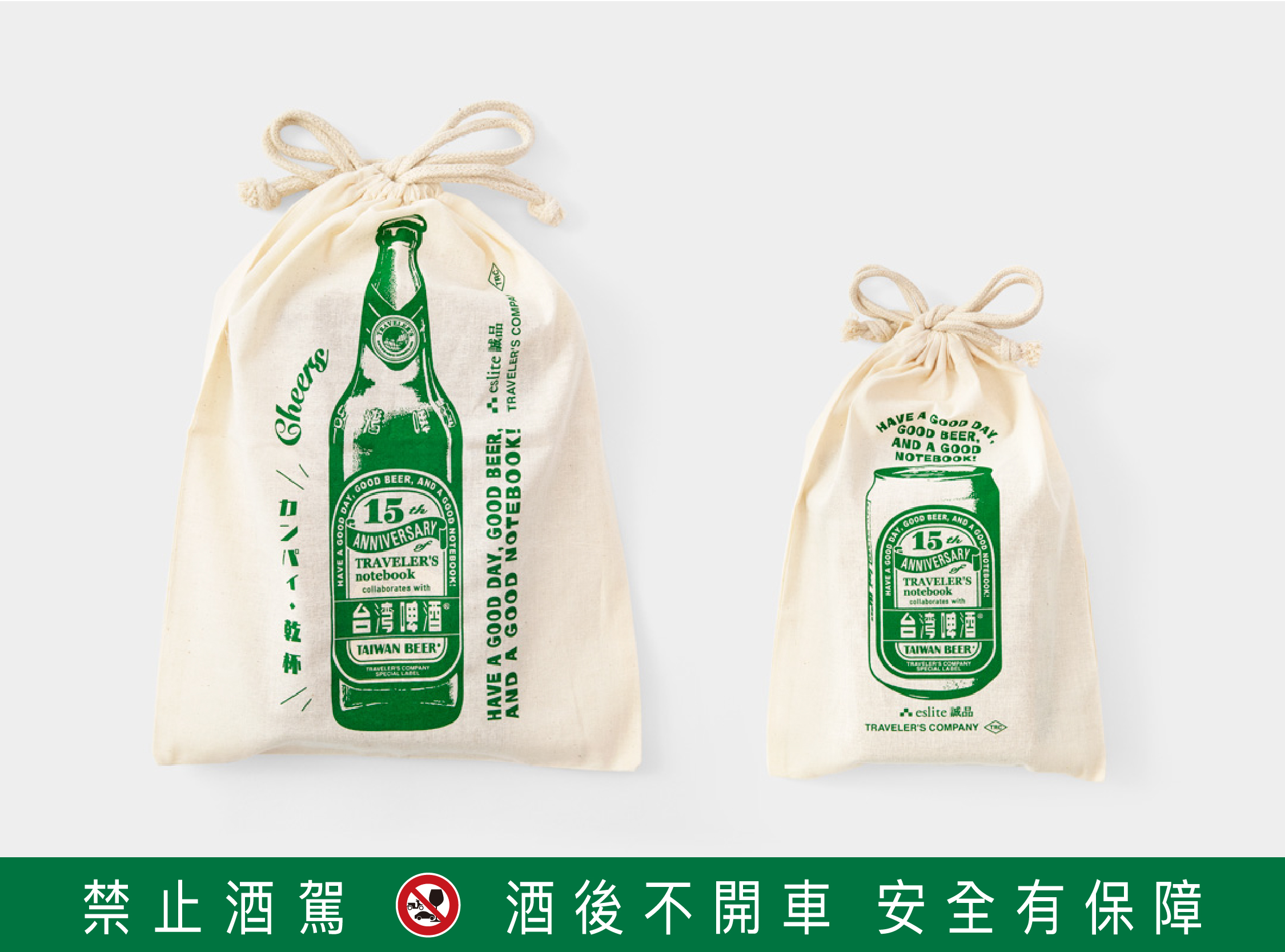 兩種不同尺寸的棉質束口袋,分別印有15週年紀念的台啤小罐裝、酒瓶設計。