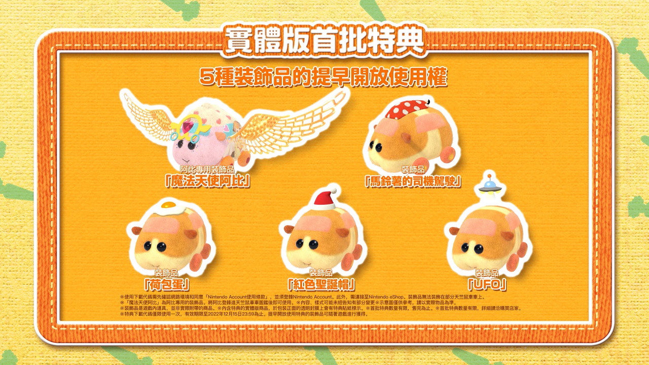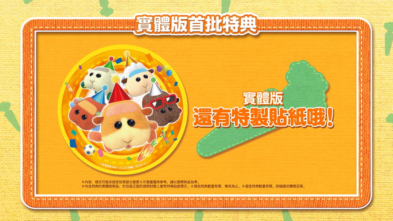 購買首批實體版的玩家,除了上述5種裝飾品的提早開放使用權,還能額外獲得《PUI PUI 天竺鼠車車 一起來!天竺鼠車車派對!》特製貼紙。