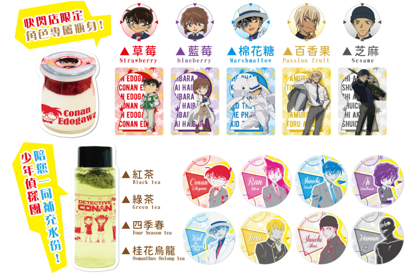 不同風味的奶酪、茶飲及甜點,滑嫩的奶酪口感搭配各種角色元素配料,柯南的草莓、小哀的藍莓、基德的棉花糖口味……讓人每口都能感受到角色所屬的好滋味!更特別規畫少年偵探團冷飲瓶、奶酪玻璃瓶,瓶身以各角色元素為設計主軸,搭配專屬配色,每款都無法割捨讓人想一次收藏!最重要的是還有新一和小蘭的蘋果派,象徵戀愛的酸甜口感,購買還可獲得兩人紀念寫真一張呢!