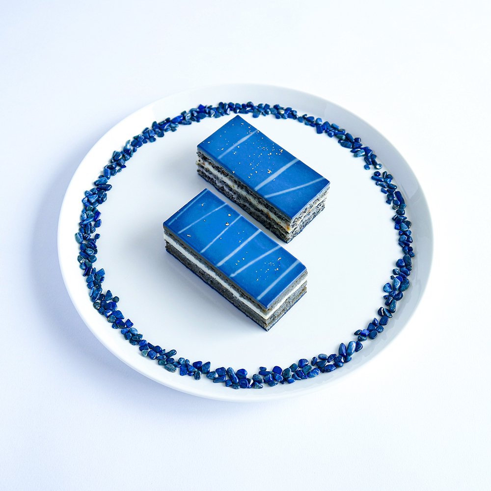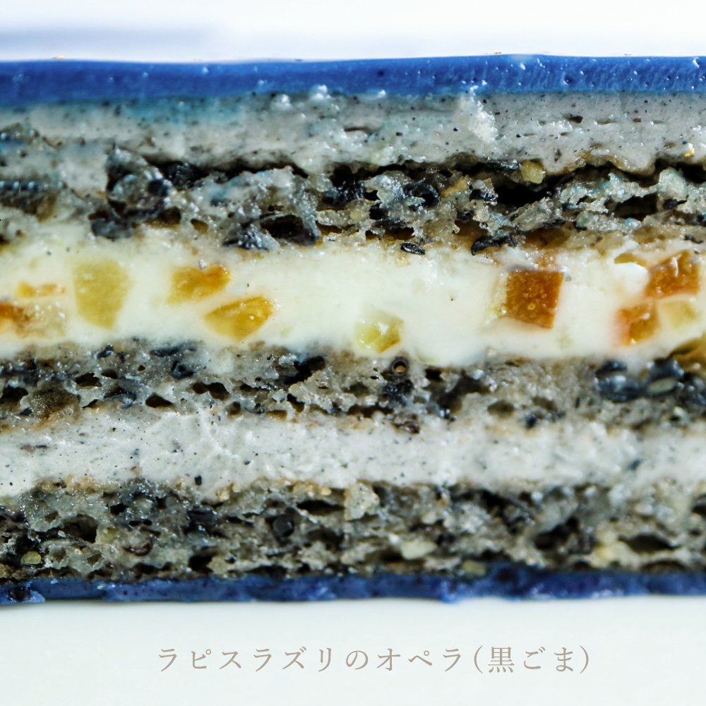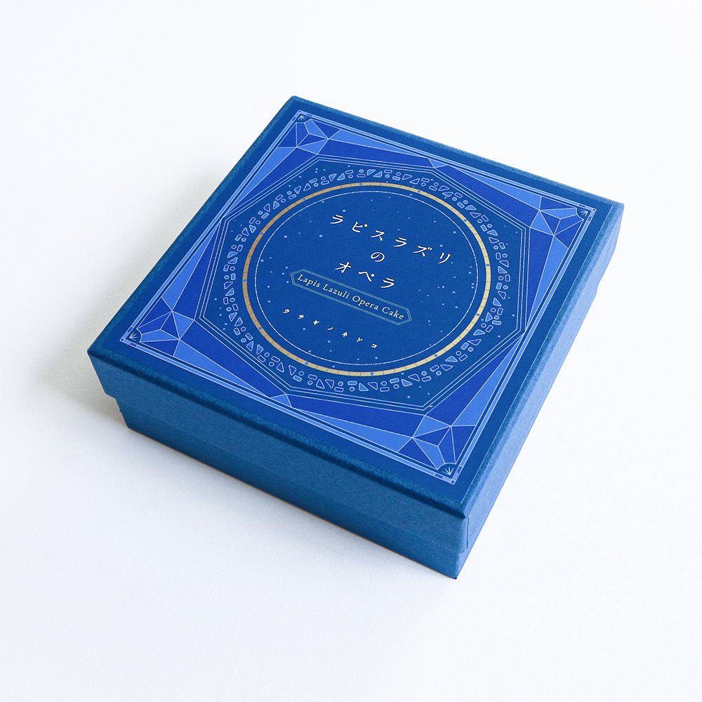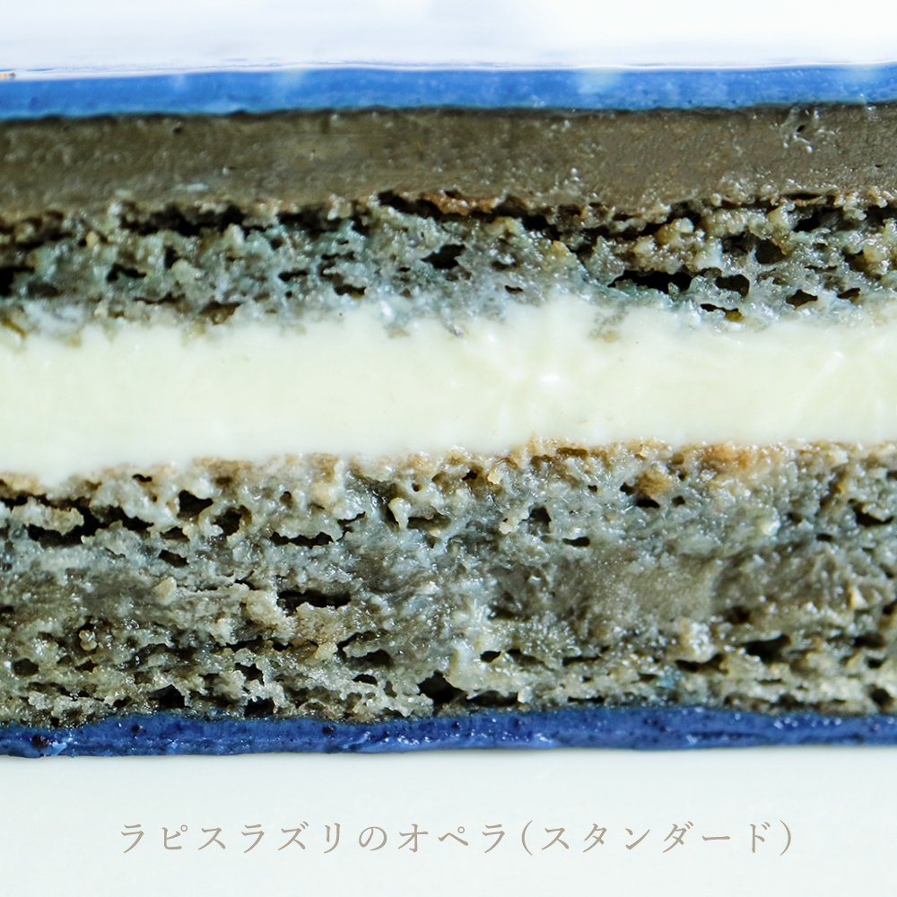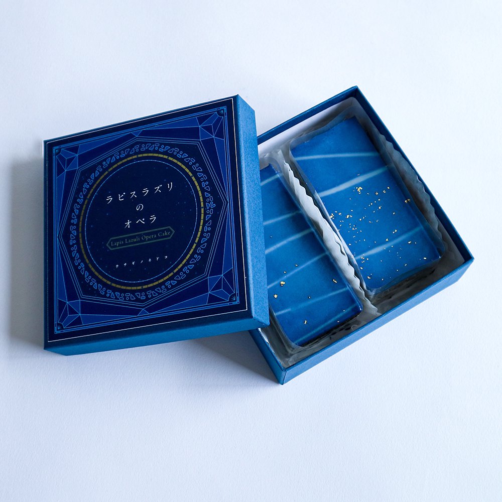 青金石歌劇院蛋糕是京都工藝小店Usagi no Nedoko在2017年推出的商品,至於為何工藝小店會賣蛋糕呢?這就要說到2017年的特展「美味礦物展」(おいしい石展)。Usagi no Nedoko當初只是展出了看起來很類似蛋糕的青金石,沒想到收到了廣大的迴響,索性自行研發了相同造型的歌劇院蛋糕。這款青金石歌劇院蛋糕在素材上使用的是蝶豆,以蝶豆的天然抽取色素來還原青金石的色澤;除此之外,中間紋理的部分則以白巧克力、奶油、黑芝麻等材料來呈現。最後,礦石上面的條痕則以金箔來表現,深藍色和金色的搭配使表面看起來就和星空一般夢幻。