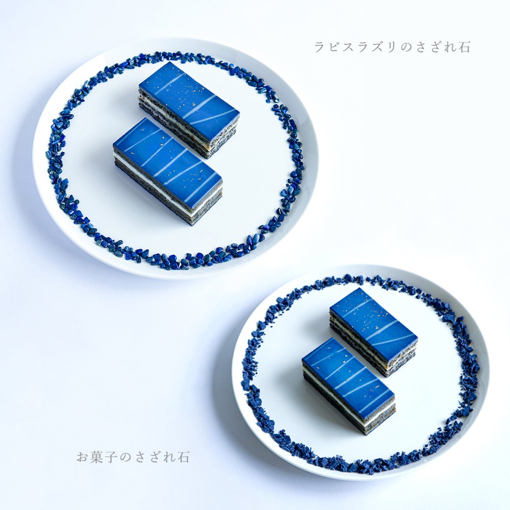 不只是在店面享用,透過Usagi no Nedoko的線上商店購買,隨商品也會附贈裝飾用的青金石。細小的青金石同時具有藍礦石和黃鐵礦的部分,根據光線會呈現不同的色澤,放在純白色的盤子上,將能和蛋糕相得益彰。如果不想要青金石,也可以改選擇青金石造型的碎石糖,口味則是莓果巧克力。
