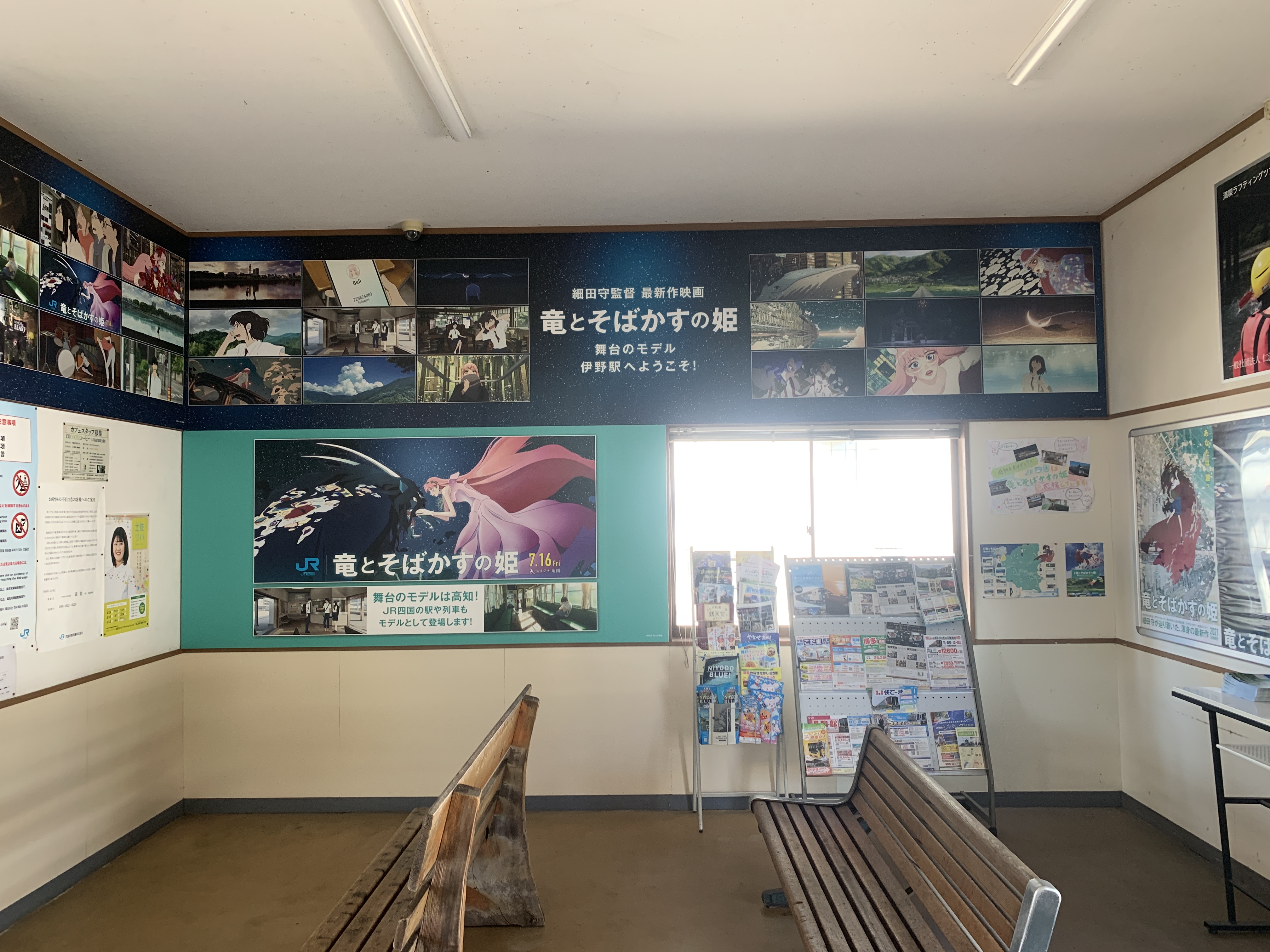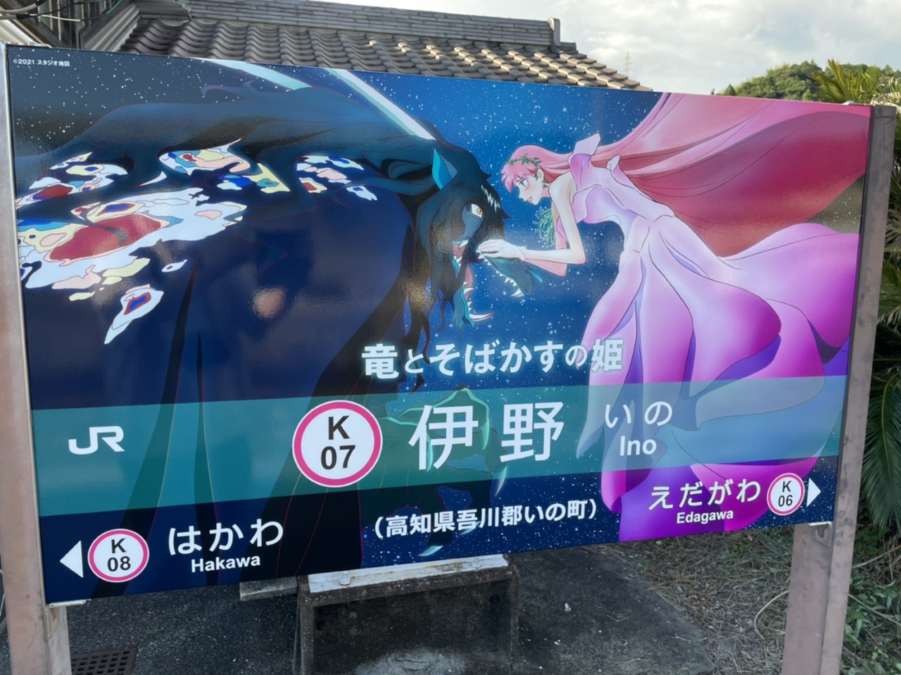 從高知車站出發搭乘 JR 土讚線普通列車約 20 分抵達「JR伊野站」,是電影劇中出現的車站剪票口及站前十字路口的場景參考。JR四國在2021年8月7日至2022年3月27日期間特別將「JR伊野站」以《龍與雀斑公主》為主題,在站內牆身及車站指示牌等處以壁貼重現電影場景。