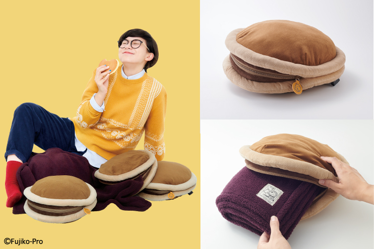 以哆啦A夢最喜愛的銅鑼燒為概念,打造可收納毛毯的圓形抱枕,附贈的毛毯也別具巧思,特別選用紅豆餡的色調,重現銅鑼燒的風貌。