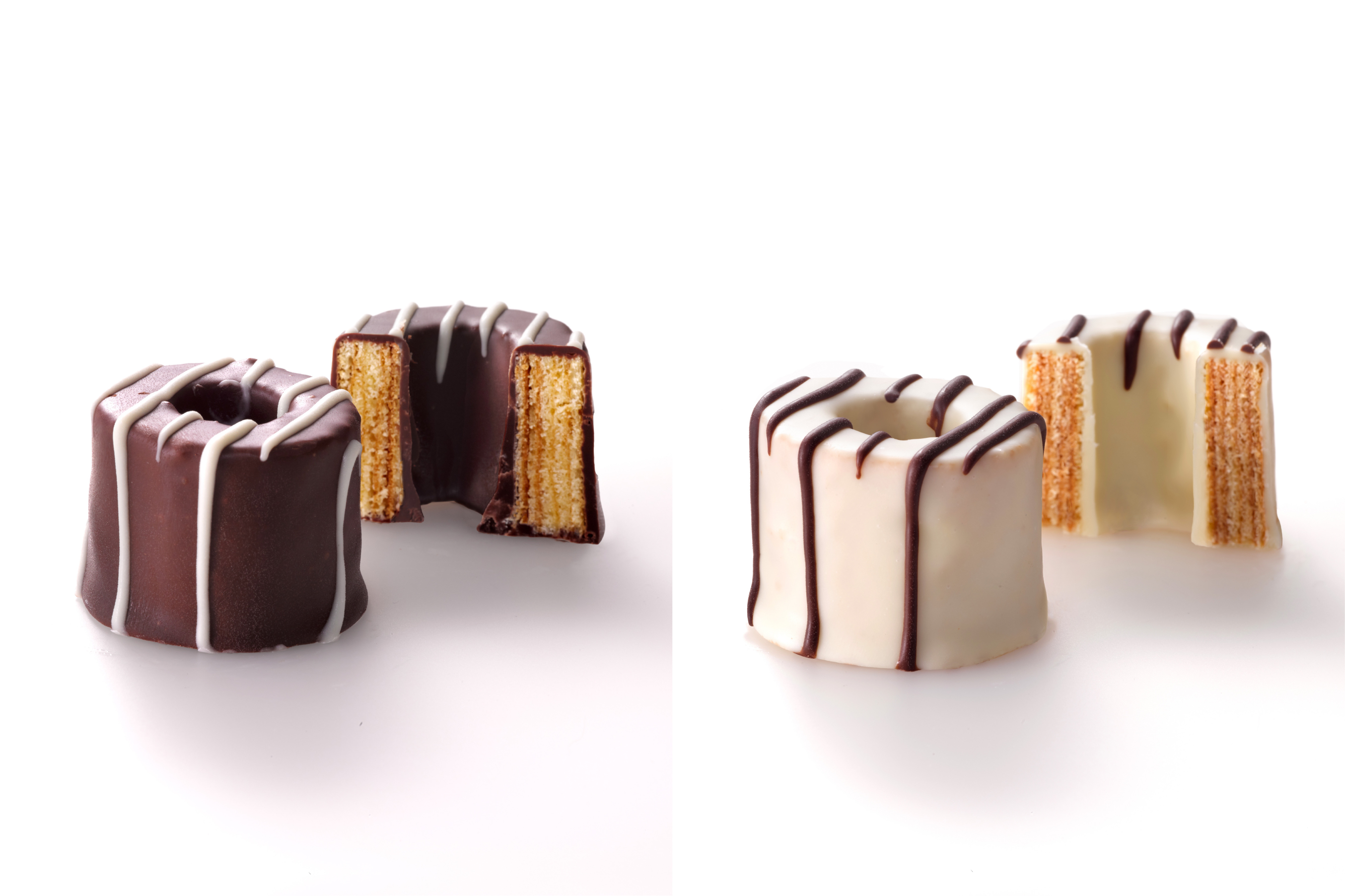 巧克力迷你年輪蛋糕(原名ショコラ バウム)做成了一口Size,一口一個,甜味恰到好處,保證吃到停不下來。另外,在外觀上,店家也下過巧思,在蛋糕表面淋了一條一條的巧克力醬,創造出棒棒糖般的視覺效果,充滿童趣。價格為4入組540日幣、10入組1,080日幣、20入組2,160日幣。不管多少顆,每一組內都包含牛奶和白巧克力2種口味。