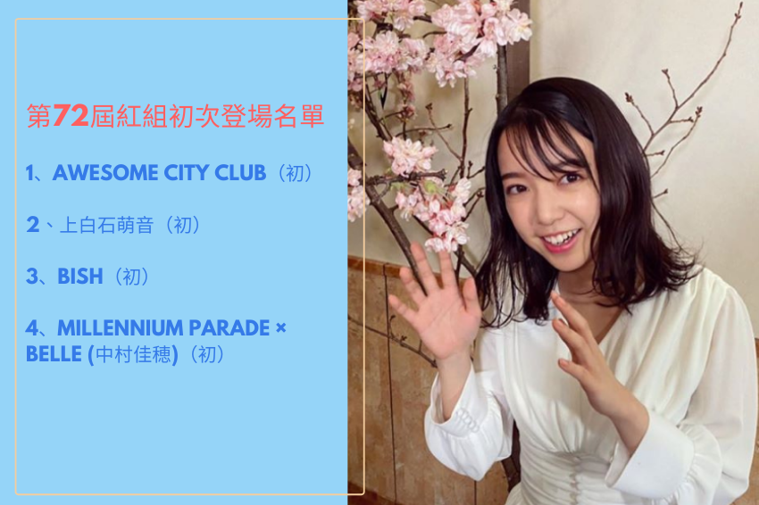 每一屆的紅白歌合戰,都有大約10組藝人是初次登場的歌手或當年的話題人物,第72屆紅白歌合戰的紅組初次登場名單如下圖,包括演唱電影《花束般的戀愛》主題曲〈勿忘〉因此一炮而紅的「Awesome City Club」以及為細田守執導動畫電影《龍與雀斑公主》女主角配音並獻唱的「中村佳穗」,值得一提的是上白石萌音雖然平時活動領域大多是在戲劇圈,但擁有一副好歌喉的她,早已推出過不少歌曲,本次將以歌手身分初次登上紅白舞台,令不少影迷也相當期待她的表現。