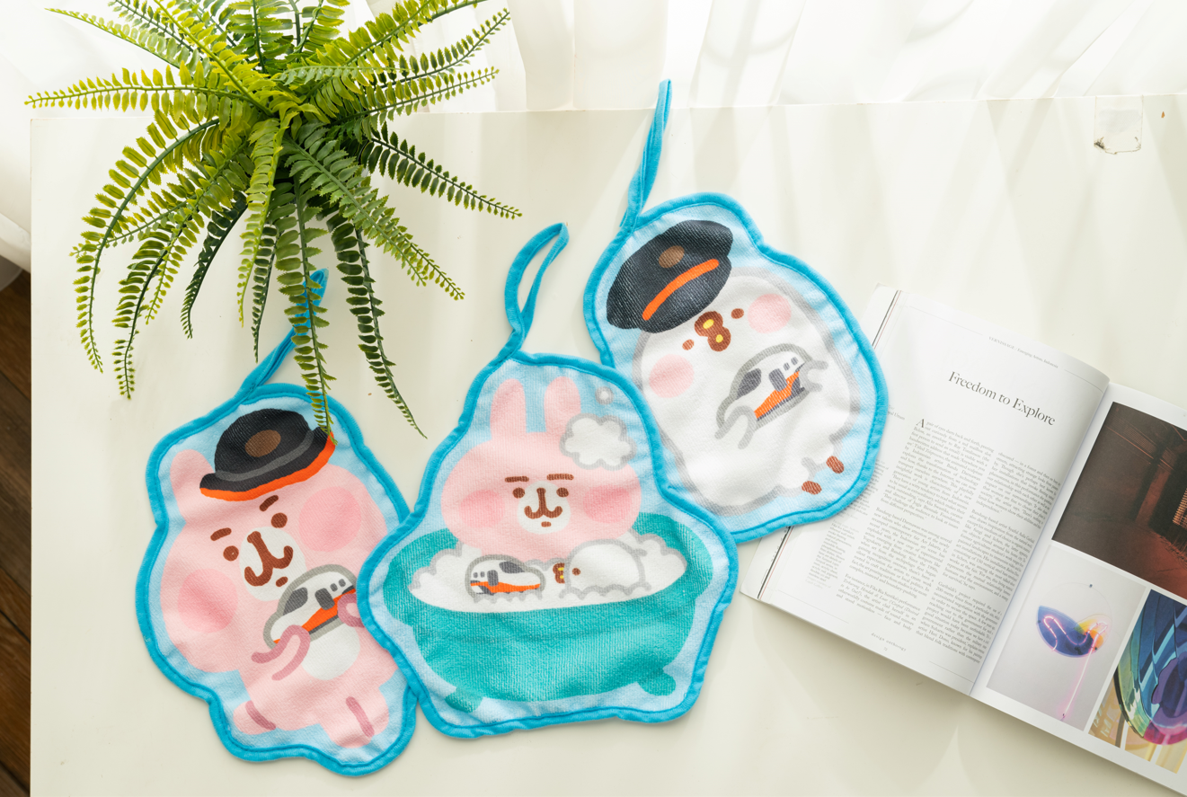浴室或廁所如果沒放擦手巾,那該有多不方便呀!P助與粉紅兔兔造型的擦手巾還印有泡澡療癒圖案,讓你如廁完能趁機摸摸牠們,感受瞬間的療癒!