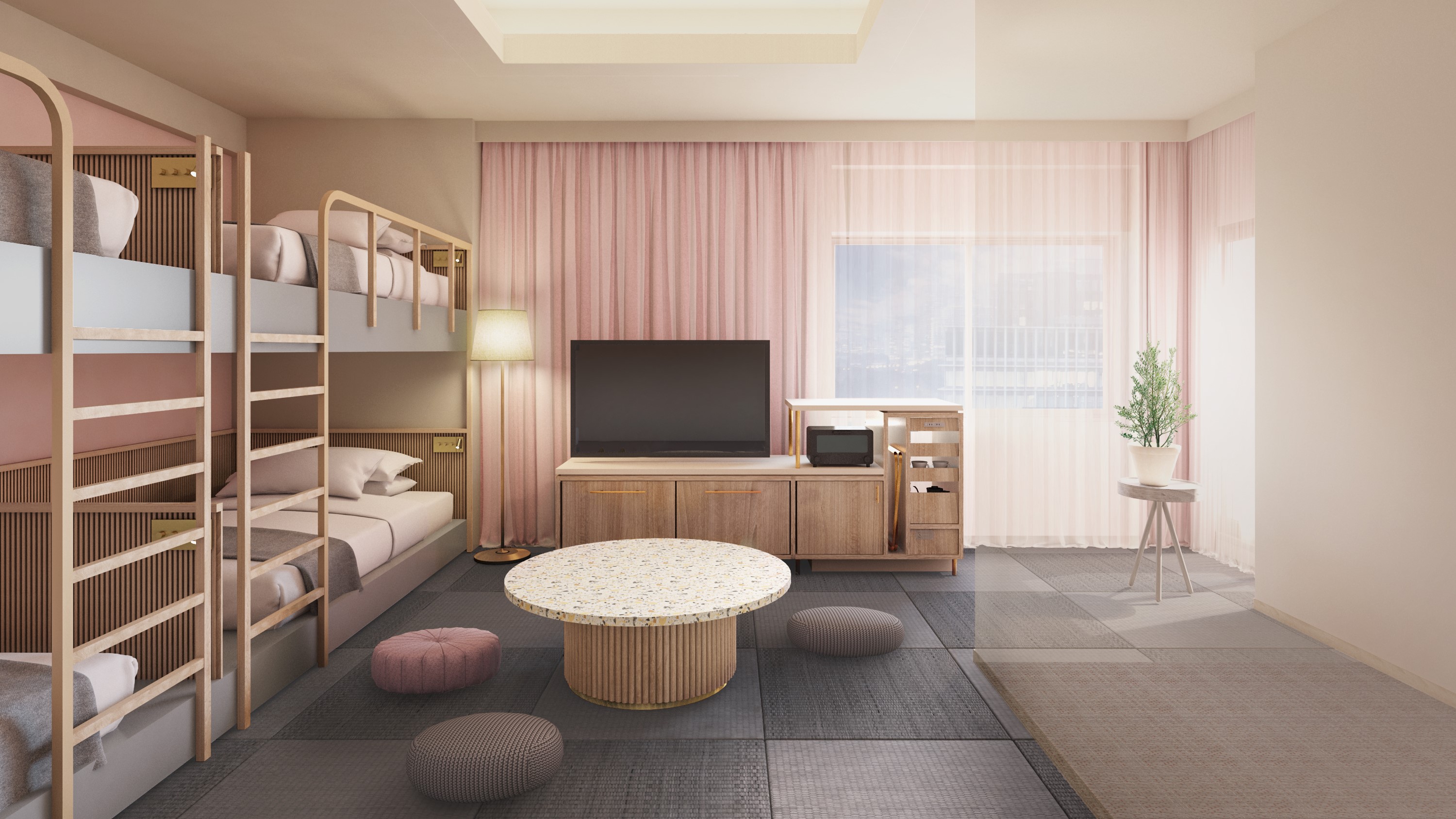 hotel hisoca的客房提供2~4人入住,兩床的房間共18間,加大雙人床的房間共11間,除此之外還有提供6人入住的3間豪華套房。最特別的是,無論有多少人入住,客房一晚的住房費都是固定的,愈多人入住就愈划算,非常適合情侶、家族和朋友出遊。上面的照片為多人房。