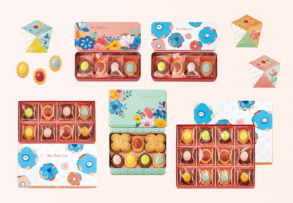 Very Ruby Cut的包裝就像珠寶盒一樣,吃完以後也可以留起來當作小物收納盒。根據個數,包裝共有8種。鐵盒特別版共有2種,一種是常駐款式,另一種是期間限定的冬季款,可以裝4顆。除此之外,可以裝3顆的包裝以鑽石為造型,消費者可以根據喜好來挑選包裝的顏色。