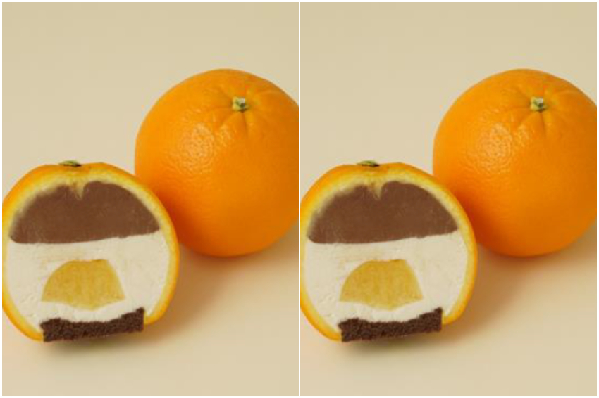 整顆柳橙蛋糕(原文まるごとオレンジケーキ)由知名蛋糕師加藤幸樹設計,果皮中塞的是黑巧克力慕斯、奶酪慕斯、柳橙果醬和巧克力海綿蛋糕。巧克力和柳橙剛好達到平衡,整塊蛋糕不會過酸或過甜,口味清爽。售價3,000日幣,含稅。一組有3顆。店面提供一顆1,100的販售方案。