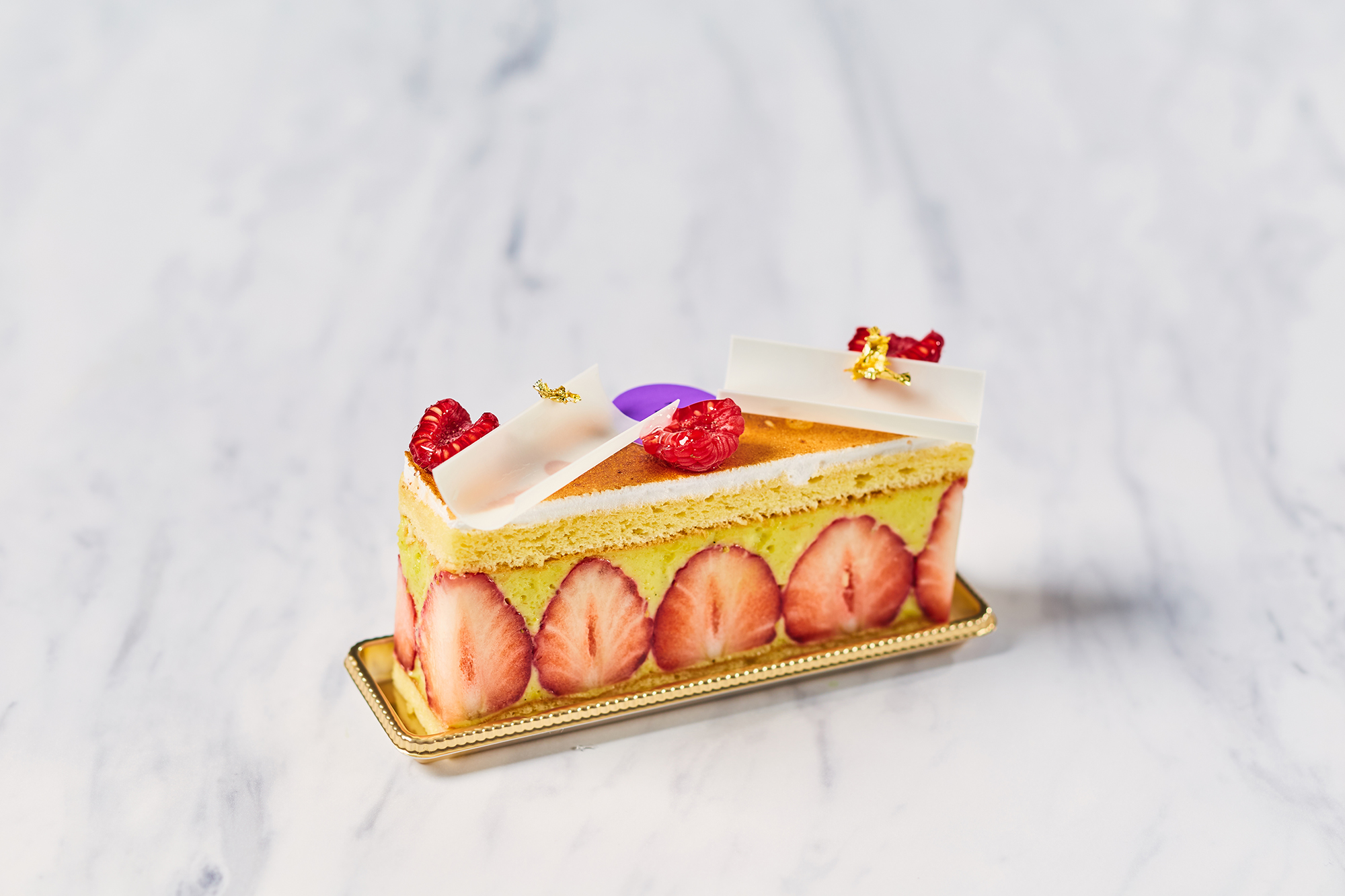 開心果草莓蛋糕的橫切面是滿滿的草莓,海綿蛋糕帶有杏仁香,開心果和櫻桃酒混合的德國奶油霜,充滿高級感。最上面更以白巧克力片搭成屋瓦的形狀,極具巧思。價格756日幣,含稅。