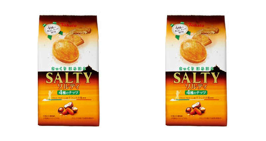 日本食品公司東鳩製造的餅乾Salty,融入了杏仁、椰子果肉、榛果及澳洲胡桃4種餡料,並於餅乾表面灑上薄鹽提味,讓人一口接著一口停不下來。