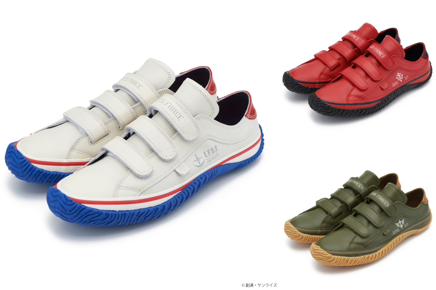 日本運動鞋品牌「SPINGLE MOVE」為日本職人製作的運動鞋,鞋面採用牛光面皮革,通過硫化製造方法製成的纏繞鞋底創造了經典形式,兼具俐落的外型和穿著舒適度,搭配魔鬼氈鬆緊帶的設計,可配合腳部調整鬆緊,推出和鞋帶類型截然不同的款式,為時尚達人的必備鞋款。SPINGLE MOVE 聯名「機動戰士鋼彈」魔鬼氈皮革運動鞋包含鋼彈款、薩克款、夏亞專用薩克款。其中綠色薩克款只在台灣萬代南夢宮官方網路商店「PREMIUM BANDAI」販售,薩克粉絲別白跑一趟囉!