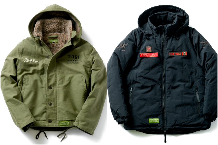 ▲ARMS系列「機動戰士鋼彈」法國軍用規格夾克吉翁勢力款(左)、美國軍用規格夾克紅色彗星款(右)。