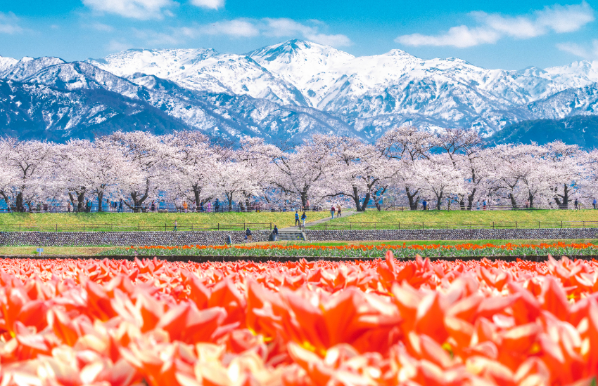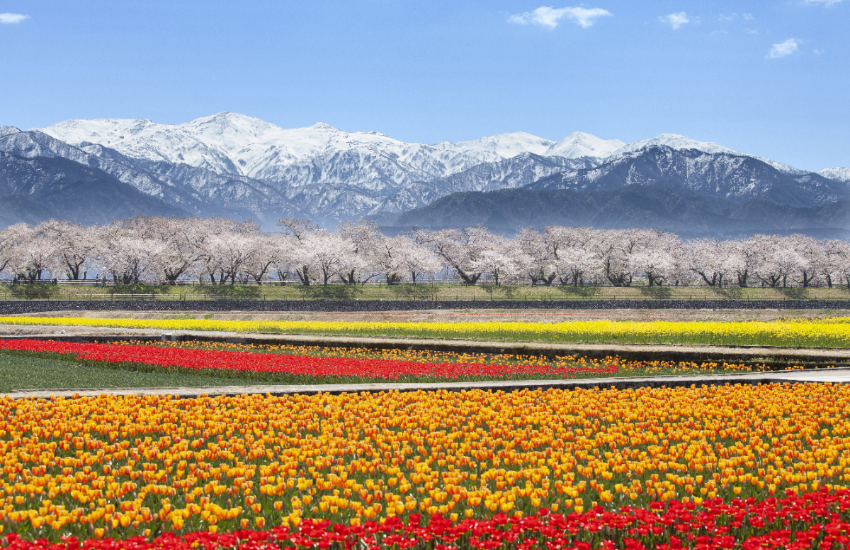 富山縣朝日町近日本海,位於著名的「黑部宇奈月溫泉」旁,每年只有7天能看到的奇蹟絕景「春日四重奏」,總是吸引大批旅客前往朝聖。流經朝日町的舟川,長600公尺的堤防兩側,種植了約280棵的櫻花,成為著名的河岸櫻花隧道。每年4月上旬櫻花盛開的7天內,還能看到當地農家細心栽種的七彩鬱金香、黃色油菜花,以及遠方朝日岳山頂雪白的殘雪,形成絕美的「春日四重奏」,是別處看不到的奇蹟美景,此生一定要親眼體驗一次!