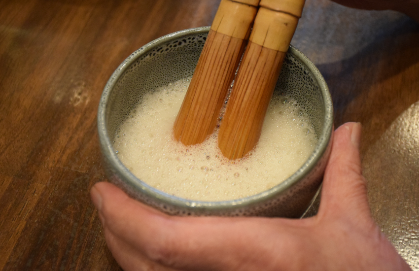 發酵的黑茶屬普洱茶的一種,是富山朝日町特有的在地茶,將黑茶放入特有的五郎八茶杯,再以成對的夫婦茶刷快速攪拌至起泡。因特殊茶刷攪拌時會發出「巴他巴他」的聲音,因此稱作「巴他巴他茶(バタバタ茶)」,來到朝日町一定要品嚐看看!
