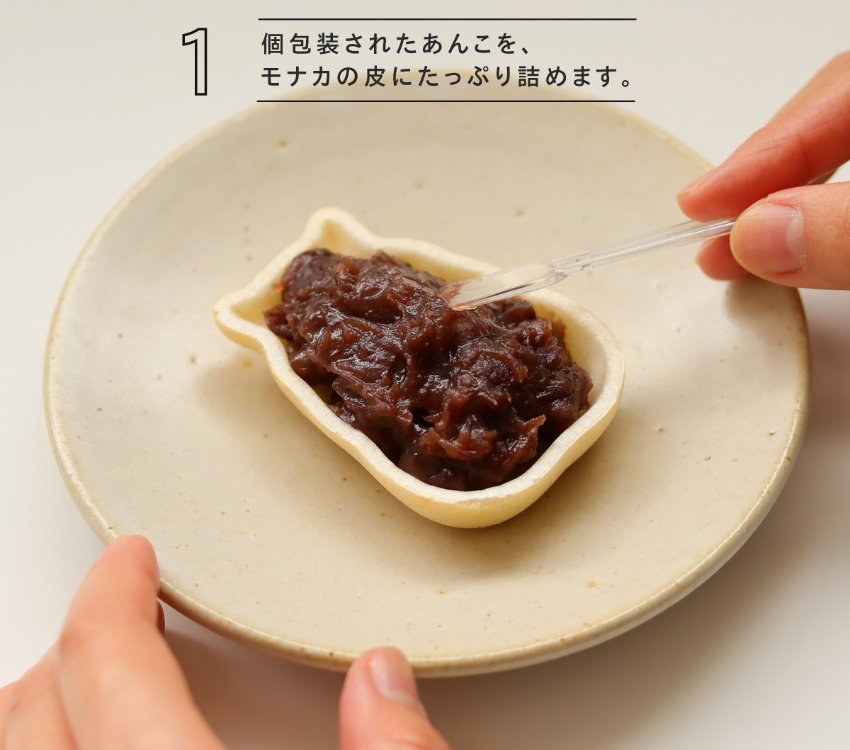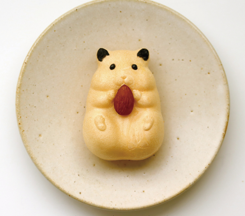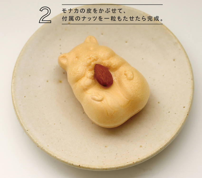 先將綿密紅豆餡倒入酥脆的最中餅皮,再蓋上倉鼠模樣的表皮後,放上灑有些許鹽分的堅果,是不是就像一隻啃著堅果的軟萌倉鼠呢?還可使用巧克力醬等為倉鼠最中餅點上五官,可愛度瞬間UP!