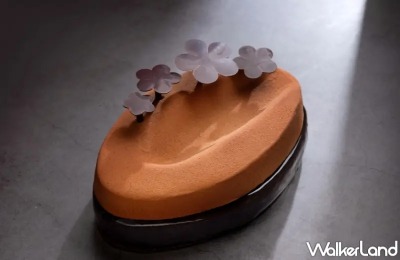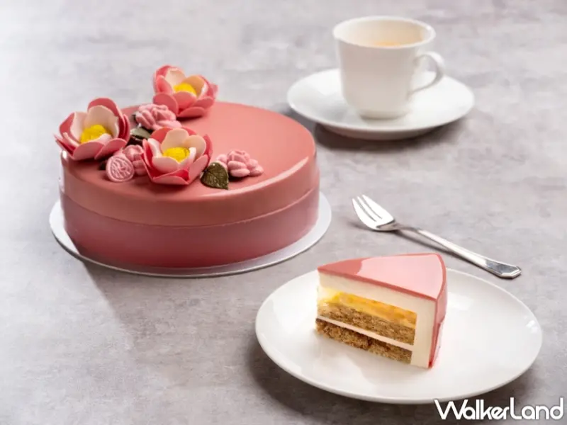 還有「精萃山茶花」, 創意取自母親身上散發的山茶花香水,此款高調卻優雅的蛋糕,萃取歐洲山茶花精華,以茶葉揉和法國經典杏仁比斯吉,配上鳳梨、香蕉、柳橙等六種熱帶水果慕斯,裹覆自製柑橘風味法國香檸檬果泥蘆薈、熱帶水果餡、榛果脆餅,再由玫瑰色調鏡面淋醬包覆,鑲上奪目的手工巧克力花瓣,滿足視覺、味蕾驚豔的極致糕款。