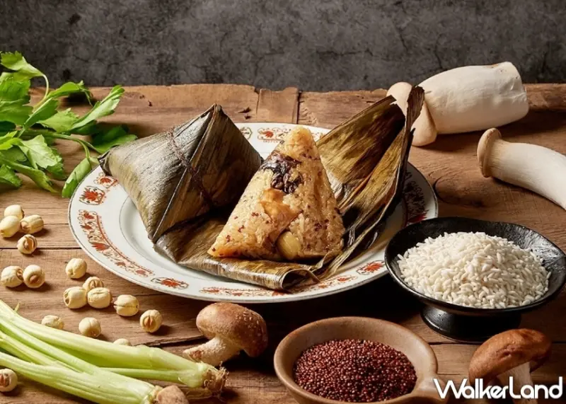 另一款「養生菌菇素粽」內餡添加有穀類紅寶石之稱的紅藜麥,搭配口感爽脆的茶樹菇、鮮嫩多汁的杏鮑菇、香氣厚實的香菇等,入口後綿密清香,纖食養生。