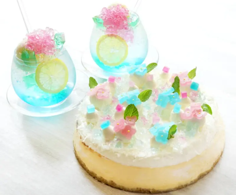 本次登場的第一款繡球花甜點為「繡球花起司蛋糕(紫陽花チーズケーキ)」,微甜的紅豆沙餡搭配妞約起司蛋糕,表層再以純手工製造的琥珀糖及晶瑩剔透的果凍妝點成一朵朵盛開的繡球花,將日式傳統甜點與西式甜點融合,可感受到店家滿滿的創意與巧思。![]()