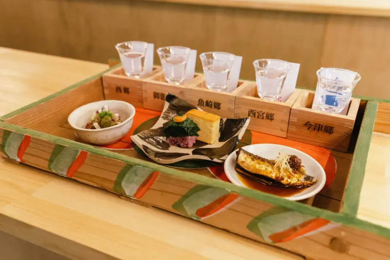 標榜能完美搭配各種食材的「灘之酒」,特色是香氣撲鼻、口感濃郁緊實且爽口,入口後清洌不甜、餘韻悠長,與菜肴的味道不衝突。開幕後推出的「灘五鄉酒所套餐(定價2,400日圓)」以烙印著灘五鄉字樣的木枡,選擇喜歡的日本酒,佐以由自然派餐廳「amasora」的料理研究家池尻彩子監修、運用劍菱日本酒與神戶漁師捕獲的當季食材,開發出以「時令」、「發酵」、「相容性」、「地產地銷」為主題的酒餚料,品嚐灘五鄉出神入化的美味。