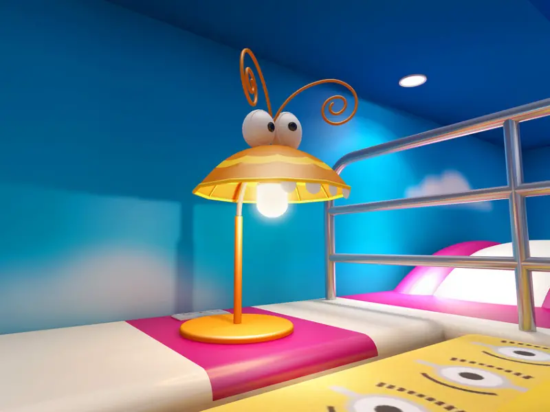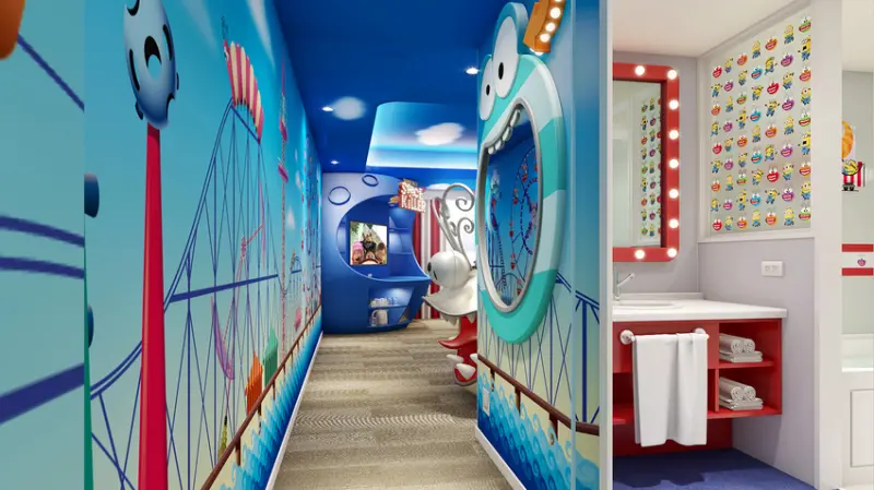 本次影城港灣酒店推出的第三彈小小兵新房型,是以《神偷奶爸3》當中格魯帶著三個女兒去的遊樂園「Super Silly Fun Land」為主題,走入房內立刻就會看到牆上的遊樂園景色和天花板上繪製的藍天白雲,彷彿與三姊妹們一同踏入了遊樂園;最吸睛的莫過於奇妙生物外型打造的「仿雲霄飛車」三連床,突破傳統平行擺設的設計,將床鋪以雲霄飛車的造型,分別將三張床以L型的模樣放置,增添不少童趣。