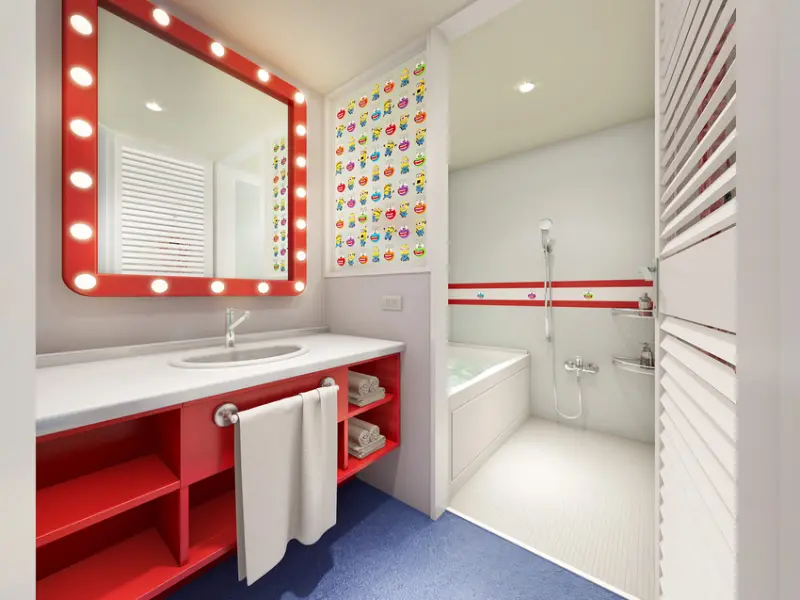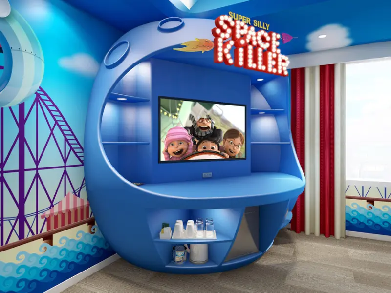除此之外,二女兒「安安」在樂園挑戰而獲得獨角獸娃娃的「太空殺手」遊戲機也製作成精美的電視牆、房內還有外太空生物造型的鮮黃燈罩都相當吸睛,讓人走進房內彷彿來到電影《神偷奶爸3》的場景中,無論是床鋪、浴室,或是牆面上的擺設,都一一重現電影中的經典畫面和元素,且房內還提供多款特製的小小兵贈禮,讓旅客都可以帶回家留作紀念。