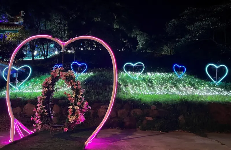 大古山登山步道公園設置燈飾藝術拍照打卡點,喜愛記錄生活的朋友,能一傳十十傳百,一同漫步於大古山藝術光廊,沉浸在璀璨絢麗的夜晚,還能將照片上傳IG,參加活動贏得獎品!