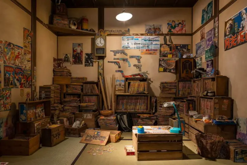 除此之外,還重現了鈴木敏夫在1950年代少年時期所住的房間裝潢,在四枚半榻榻米的空間裡,牆壁上貼滿了鈴木敏夫最愛的海報,還有在房間塞滿的各類漫畫月刊,鈴木敏夫就是在這樣的小環境當中,摸索出經營吉卜力工作室的一點一滴。