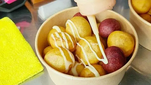 近年地瓜球的顏色可說是千變萬化,單一黃色已經不稀奇,有些還會混入紫色地瓜球,更吸睛的是製作成寶可夢粉絲最愛的「寶貝球」造型、黑黃條紋交錯的「小蜜蜂地瓜球」也讓網美爭相拍照;而在台中人氣爆棚、整顆由裏黑到外的「黑心地瓜球」,除了色澤「毆罵罵」還可以加上煉乳、肉鬆、花生粉當配料,大大挑戰地瓜球控的味蕾。![]()