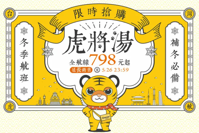 雖然3款套票都已完售,但好消息是一般機票的優惠促銷期間又加長了!原本預計從5月25日早上10點起開賣,至5月26日早上9點59分結束優惠促銷,不過由於網友們搶買的狀況相當熱烈,因此台灣虎航又宣布加長販售時間,到5月26日晚上11點59分才會正式結束促銷,並且加倍優惠席次!有興趣的民眾不妨把握倒數不到一天的時間試試手氣。
