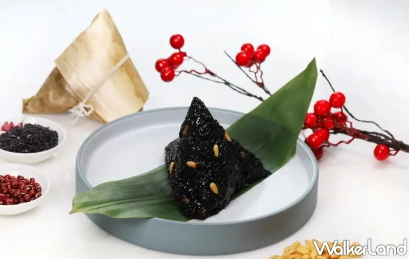 而松子抹茶紅豆粽裡面所選用的黑米又稱長壽米,古時被當作朝貢的貢米,可見其營養價值,為增加口感豐富度,另加入紫米,以紅豆、松子為餡,入口即有松子清香,伴隨著綿密細緻的紅豆,甜而不膩,蒸煮後也能冰鎮後食用,消去暑氣燥熱,別有一番風味。
