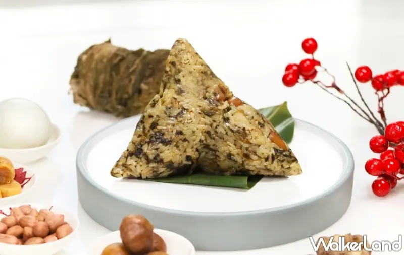 此外,陳年梅菜黑豚粽將客家梅乾菜有獨特香氣與鹹度,清洗後切成碎丁,以豬油爆香,和糯米、蝦米、瑤柱、紅蔥頭末一起拌炒,讓香氣浸潤到米粒,另選用上等黑豬腩,以生抽、桂皮、月桂葉、蔥、蒜、薑煨煮入味,和入拌炒好的餡料中,具有畫龍點睛提味的效果,肉質Q彈帶有古早味,搭配梅干菜與鹹蛋黃,瞬間觸動腦海時光按鈕,吃的不只是美味還有滿滿的感動。
