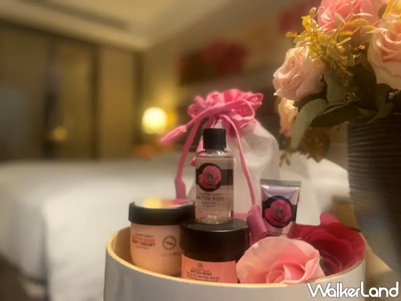 福容台北一館首度與The Body Shop攜手聯名推出「城市質感住房專案」,The Body Shop於飯店布置專屬玫瑰花房,走進門映入眼簾的即是玫瑰花圖騰,地毯上鋪了粉紅色圓形長絨地墊,網美氛圍感提升,專案贈送經典保養禮盒玫瑰組,更是為拍照加分的擺設,內含英皇玫瑰澎潤補水面膜75ML、 玫瑰嫩膚沐浴膠60ML、 玫瑰嫩膚護手霜30ML、英皇玫瑰嫩膚保水美肌優格200ML,價值2,190元,以熱銷玫瑰護膚品,給自己一個玫瑰香氛小假期。