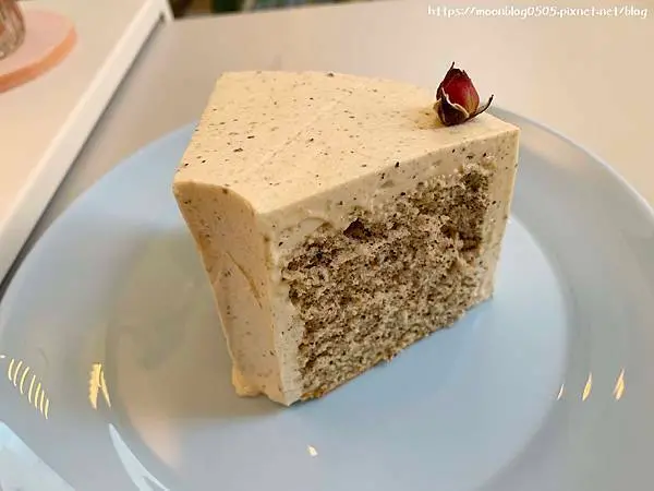 很喜歡這家甜點的味道,都不會太甜,保留了原本食材的味道,外面的奶油是伯爵口味,充滿茶的香氣。蛋糕本體則是芝麻口味的,戚風的口感偏鬆,比較乾一點,建議要搭配伯爵奶油一起吃…<全文介紹>