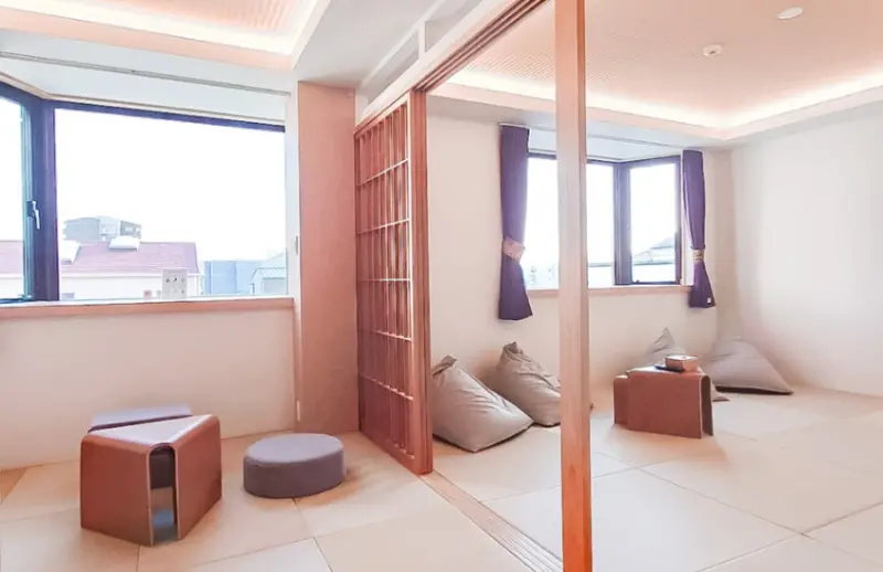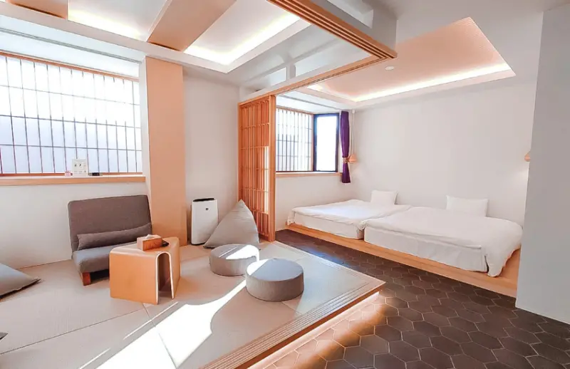 Hotel Imagine Kyoto共提供5種房型,分別是Superior Twin、Standard Twin、Deluxe Twin、Family Suite和King Room。Superior Twin最多可容納5名房客,客房大小約36評分公尺,房內有2張預設的床,並可加鋪3組床褥。房間地板除了鋪有塌塌米,也放了懶骨頭「yogibo」。最棒的是,浴室內同時有浴缸和淋浴設備,並且是乾濕分離,洗手台有2組,可以同時供2人梳妝打扮。Standard Twin設備和Superior差不多,只是洗手台只有1組,浴室較小。![]()