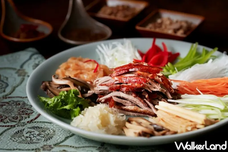 「黃金片皮鵝捲餅」主廚以精鍊刀法將燒鵝逐一片下、搭配上全麥餅皮、特製的甜麵醬以及蔥段、黃瓜段一起享用。「響螺七彩鵝絲」主廚將鵝肉、響螺、海蜇、蘋果、柚子、青椒、紅椒、北菇、香菜等多達十三種食材切成細絲與小丁,淋上芥末沙拉醬及XO醬後涼拌均勻,最後再灑上松子及腰果碎,交疊著鵝肉鮮嫩柔軟、蔬果清新爽口,結合醬汁酸甜帶辣的多重口感,帶給賓客驚豔享受。