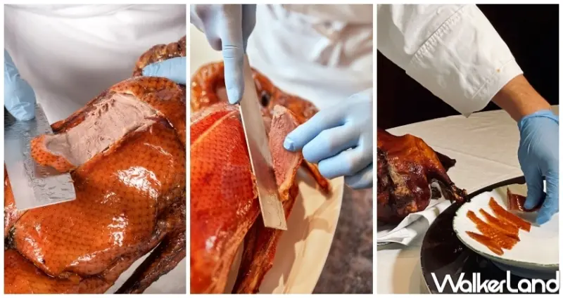 還有在南港小有名氣的台北六福萬怡酒店粵亮廣式料理「神仙乾坤燒鵝」,主廚光是備料、醃製、填入內餡、淋脆皮水、風乾等程序就堅持要一天一夜,待醬料味道完整滲透進鵝肉後,再用百萬級大型專業烤爐,精準管控不同的溫度及時間,分成3階段烘烤,讓鵝皮光滑酥脆,鵝肉細嫩多汁,最後把蘋果木煙霧注入料理罩內進行燜燻,使鵝皮帶有濃郁的果木燻香,料理罩於桌邊上菜時再掀開,四溢的煙霧繚繞在烤鵝周圍,宛如仙境般料理。